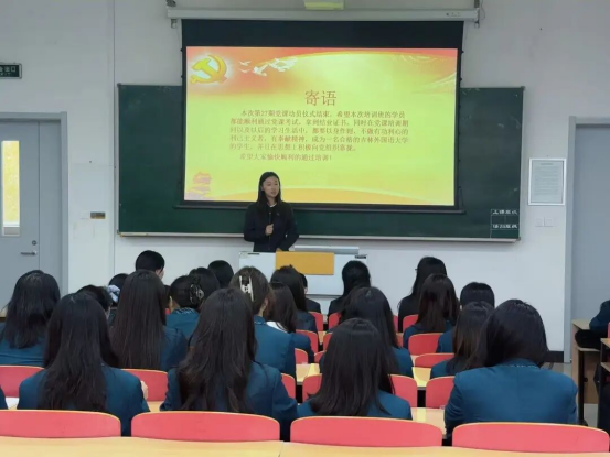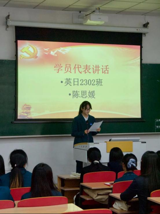 学员代表陈思媛在发言中,衷心感谢学院党总支提供的宝贵学习机会,并代表全体学员郑重承诺:将以饱满的热情投入培训,认真学习党的理论知识,努力取得优异成绩,不辜负组织的信任。她表示,将以更高标准严格要求自己,积极为学院、学校和国家发展贡献青春力量。
